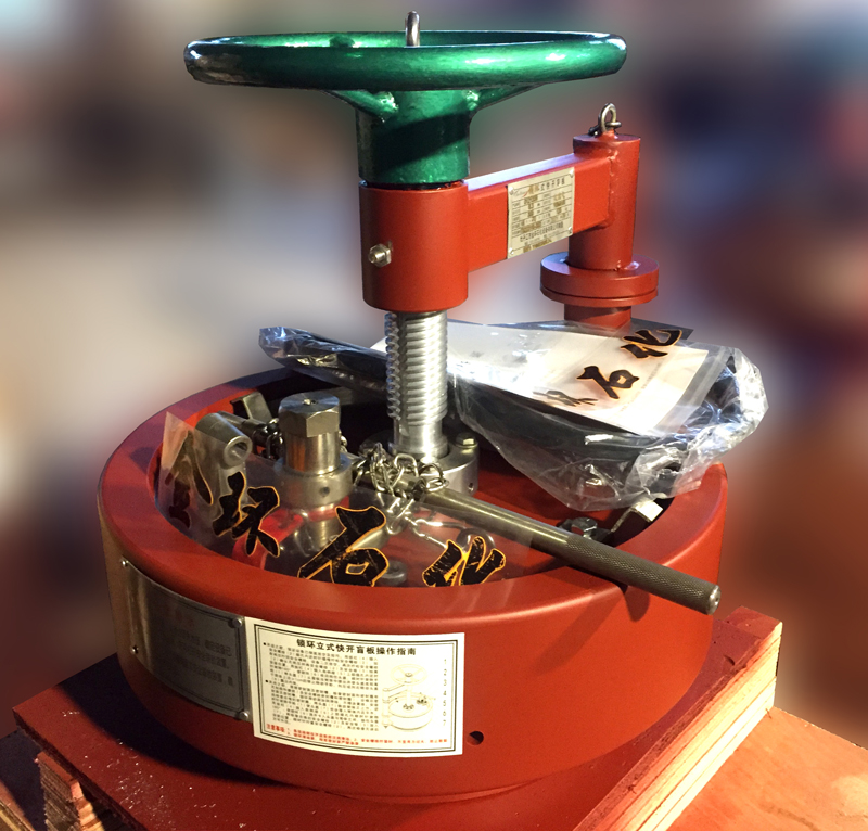 快開(kāi)盲板是用于壓力管道或壓力容器的圓形開(kāi)口上的一種機(jī)械裝置。一般由筒體法蘭、頭蓋、勾圈或卡箍、密封圈、安全聯(lián)鎖機(jī)構(gòu)、開(kāi)閉機(jī)構(gòu)、轉(zhuǎn)臂及短節(jié)(需要時(shí))等部件構(gòu)成。